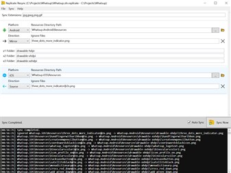 Speed up your cross-platform iOS and Android development by automatically synchronizing image assets. Choose your iOS or Android resources folder as base, and watch your assets get copied and renamed automatically to your other project's resources folder when the base folder changes. Assets automatically get renamed and moved to the correct folders based on their drawable-ndpi folders or @nx suffixes.
