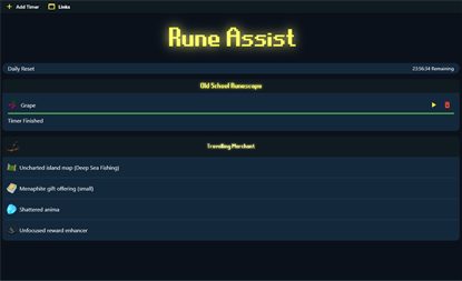 A Timer application for a variety of Runescape timers, such as farming timers, birdhouses, and other miscellaneous tasks. As well as some Utilties including travlling merchant current stock