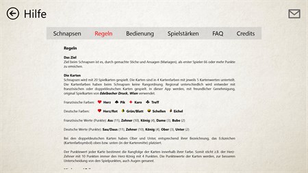 Schnapsen the exciting trick card game with only 20 playing cards and simple rules. Quick to learn with a long game of fun. Challenge Karl, the best virtual player who acts humanly and with 10 skill levels of playing strenght is the ideal opponent for beginners to experts.