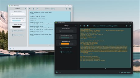 A minimalist and intuitive serial monitoring application. Supervise data received through a serial port on up to four ports simultaneously. Device configurations are saved for quick access in the next session. In addition, the entire workspace is restorable on startup. Of course, it is also possible to send data to the port. If necessary, the received data can be exported for a later review. The application supports light and dark mode, but if the color scheme is not appropriate, it can be adjusted through the application settings.