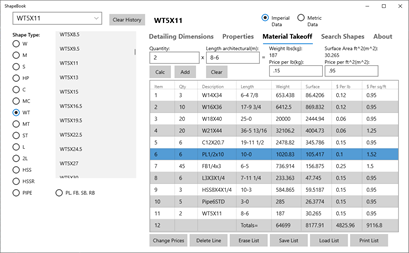 The shape data in this version of ShapeBookWith2D3DSteel is based on the AISC Shapes Database version 15.0 (V15.0) and is available in US imperial and metric units consistent with the AISC - American Institute of Steel Construction Manual, 15th Edition. Included is the ability to enter plate, flat bar, round bar, and square bar with weight, surface area, and price extensions. The take-off material lists include a dated title, page numbers, line numbers, and column and row outlines. The material lists can be saved to files and loaded back into ShapeBookWith2D3DSteel or imported into spreadsheet or database software. You can estimate steel based on price per pound and price per square foot. A method commonly used by fabricators, detailers, and coating professionals.