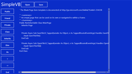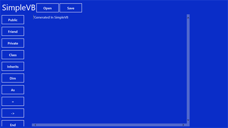 SimpleVB allows you to create, edit and save simple Visual Basic language code files.