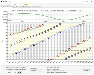 - Computing the rise and set times of astronomical bodies. - Predicting the phases of the moon, and the dates of lunar and solar eclipses. - Computing the date and time of the Solstices and Equinoxes. - Plots of the Solar Analemma and Equation of Time. - Almanacs giving the annual rise, set and meridian transit times for the sun and the moon. - Predicting passes of the International Space Station. - Showing the sky as it would be observed from the surface of another planet. - Computing "Mars Time". - Plotting the corrections that are required for Obliquity, Nutation and Precession. - Plotting the corrections that are applied to the RA and Declination of the stars. - Showing the current location in the sky of the GPS, Glonass and Iridium satellites. - Converting Latitude and Longitude to UTM and vice versa (WGS-84 only). - Local times are referenced to daylight saving time when applicable. - Historical time-zone settings can be applied for any location on Earth. - Show the date in both the Gregorian and Julian calendars - Computing the date in the Islamic and Jewish calendars.