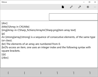 Text editor with a powerful extensible macro language and converter to HTML. Slidoxes can be used to generate HTML pages for a website from text containing tags delimited by square brackets.