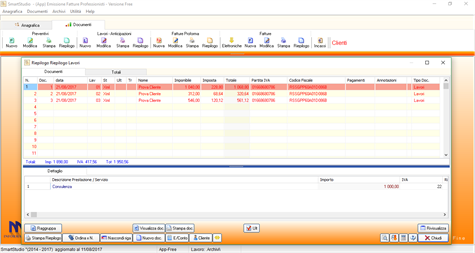SmartStudio Free è il software di fatturazione gratuito su misura per liberi professionisti, studi professionali, ditte individuali e società di consulenza. Consente di gestire: - Preventivi, - Lavori e Anticipazioni, - Fatture Proforma, - Fatture cartacee ed elettroniche con e senza Ritenuta d’acconto, contributi cassa e contributi INPS, - Fattura Elettronica, - Riepilogo di tutti i documenti per periodi selezionati