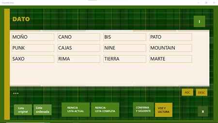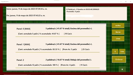 LETRAS: Un cuadro que presenta la cantidad de caracteres por letra. Tiene un formato si supera una cierta cantidad cambiará de color: negro, verde, naranja o verde fuerte. Este gráfico está disponible si primero visualiza BURBUJAS. Si pasa al panel de estadísticas sin haber confirmado paneles, no estarán disponibles. Ahora, puede ordenar la lista, de manera muy sencilla. Al finalizar visualiza las palabras de modo automático