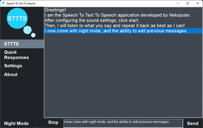 Speak to the application and it will repeat what you say as your computer's voice! You may also type what you wish to say. Just configure your microphone, your chosen sound output and a voice then you are 1 click of a button away from speaking and letting your PC repeat after you. There is also a text field below so you can write out messages too and send them. Night mode is also available!