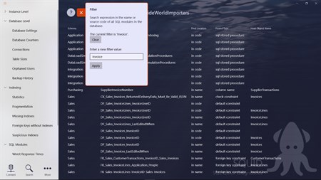 SQL Squid allows you to run a series of diagnostic queries to a SQL Server database on your machine, in your network, or in the cloud. You quickly get an impression of the quality of its schema and configuration and discover where troubleshooting is required - and where not.