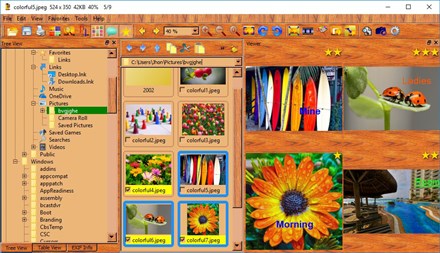 Other features Image tag, Edge detection on full screen mode, Creating contact sheet/image strip, Auto rotate by EXIF info, Screen shot, Set favorite folder, Set timestamps, Various save options and quality adjustment, Play gif-animation, Run external programs, Mouse wheel support, Skins(Pro version)