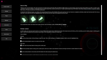 The non-exhaustive list of features includes: - multiple player profiles, each with separate settings (inc. optional PIN protected access, custom username), switching between users is possible while in the game, - multiple languages, changeable at will while in the game and settable for each user separately, - auto-saving of user settings and puzzles played (after exit and reload the puzzle resumes where it was left), - tooltip, quick help, long-version help (i.e. how to play instructions and graphical help), - a funky selector of numbered puzzles, of which, each can be played multiple times, - dial-it-down knob for easing the difficulty at will, - a "resign" button to abandon a puzzle (although each unfinished puzzle can be reloaded later on) and start a new one at will, - home view, last view, zoom, 3d rotation, slice expansion along an axis, slice view, traversing between slices around a selected field, - many assistive features like same field value colouring, taking notes, last entry repeat, erroneous entry elimination, - intuitive keyboard and mouse controls, - many selectable music tracks (with loop one or play through the collection setting) and sound effects, - played puzzles overview with statistics, - pause and lock.