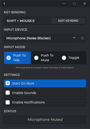 Three different modes - Push To Talk: Microphone is muted until you hold down a hotkey. - Push To Mute: Microphone is unmuted until you hold down a hotkey. - Toggle: Microphone switches between unmuted and muted when the hotkey is pressed.