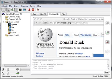 Users can chat using voice and webcam as well as share desktop applications, like e.g. PowerPoint or Internet Explorer.
