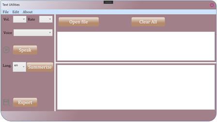 Text Utilities is an application that basically can read text loudly for the user in different languages. The user can change the parameters like volume, rate, choose male or female voice and so on. Moreover, the app also consists in a powerful text summarizer. All the user has to do, is to type in, paste or open a text file and decide whether to listen to the text or to summarize it. The Text is automatically summarized to the most essential sentences, at around 20% of is original content, thanks to a smart algorithm. The Summarized text can be exported directly within the application.