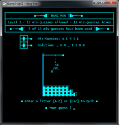 Also, A Player can Press [Esc] at any request for input to exit the individual games or to exit the application at the Main Menu.