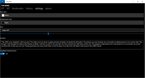 An easy-to-use Bible reader using the World English Bible (WEB) translation. Entire text included. Internet connection not required. Page through the Bible with a flick of the finger. • quick navigation to verses • history of verses read • bookmarking with notes • share multiple verses via email, text messaging and social media • copy highlighted verses to the clipboard • view verse footnotes • change font and font size