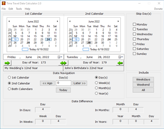 Time Travel Date Calculator can calculate the number of days, weeks, months, and years between two dates and display the values to the user in detail. Go to specific days, weeks, months, and years later or ago from a date. Learn your age in year/month/day format, the number of days, weeks, months, and years from your birthday. Time travel has two visual calendars. The date input to the calendars can be accomplished by using the calendars or date and time pickers associated with the calendars. When calculating the number of days, the option of skipping specific days or including weekdays or weekends. You can add events and birthdays and see these events on the calendar. Time Travel Date Calculator is a flexible and user-friendly program. This app requires Visual C++ distributable. This app does not support Windows 10 S.