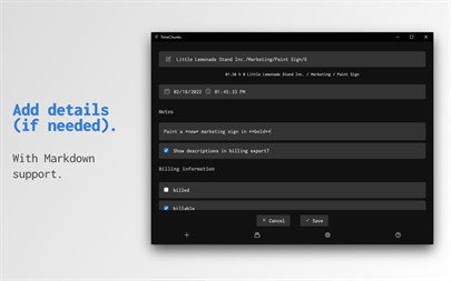 The big advantage: TimeChunks does not need (and has no) timer and no annoying HH:MM:SS input fields. For example, if you want to charge per quarter of an hour and you want to charge 45 minutes, you just type "4" instead of "00:45:00", i.e. one TimeChunk would be 15 minutes or 900 seconds in this case.