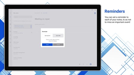 - Ability to creating custom folders to storing your notes, with a password protection ability! - Full work with notes (creating, editing, moving, deleting and etc.) - Ability to work with multiple notes at the same time - Data synchronization between all your devices (Microsoft account need) - Search - Print support - Sorting - Backup support - Gestures usage for the app control (only for touch screen) - Adaptive theme change, depending on lighting conditions (if there is light sensor) - Authorization by password (optional, with recovery support) - Flexible settings of the interface and other...