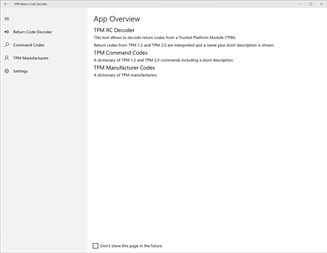The TPM Return Code Decoder allows to decode error codes returned by or look up commands available on Trusted Platform Modules (TPM) of version 1.2 and 2.0.
