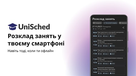 UniSched — це твій зручний помічник з розкладом занять, важливими новинами та крутими подіями твого університету, переходом до дистанційних занять, корпоративної пошти, журналу успішності, навчального середовища, і все – в один дотик!