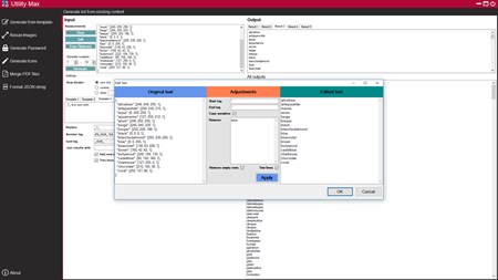 Using Utility Max enables you to - generate text content and lists from selected input values and set up templates - resize multiple images at once without the need to use any additional tool - generate icons from png files - generate passwords by the settings - combine multiple PDF files into one - format JSON string and convert it to XML