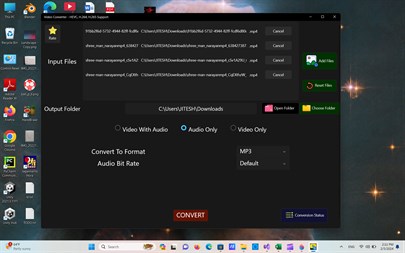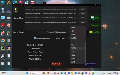 Supports Conversion for :- 1. Video to Video with Audio : Convert videos to different video formats. 18+ formats supported 2. Video to Audio : Convert videos to different audio formats. 12+ formats supported 3. Video to Video only with no Audio : Convert videos to different video formats with no Audio. 19+ formats supported 4. Batch Conversion : Convert Multiple Files in one go