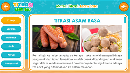 Titrasi Asam Basa | Aplikasi ini berisi materi tentang Titrasi Asam Basa diantaranya adalah Larutan, Indikator, Jenis, Kurva, Konsentrasi. Selain itu terdapat juga menu Pra Lab dan Laboratorium Virtual. Pra Lab berisi materi mengenai Keselamatan laboratorium, Pengenalan Alat, dan Simbol Bahan. Sedangkan untuk Laboratorium Virtual disajikan simulasi praktikum Titrasi Asam Basa.
