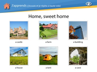 J'apprends : en appuyant sur les images, l'enfant découvre des mots ou des expressions qu'il peut s'entrainer à répéter à voix haute. J'entends : il entend un mot ou une expression et s'amuse à retrouver l'image correspondante. Je vois : il cherche parmi quatre propositions l'expression orale associée à l'image affichée.