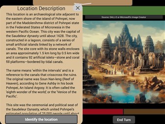 Each game selects 12 historical locations, 12 historical people, and 12 historical objects, all based on Wikipedia pages. Each turn, move to a new location and question the witness there, guess the location name, witness name, object name, and the name of any suspicious person the witness saw. Easy to play, hard to win. Location and witness descriptions are historically accurate but suspect and weapon descriptions are fun and maybe helpful, generated by AI as from 'unreliable witnesses'. Images for the locations are not historically accurate, but AI-generated and make the game unique and fun.