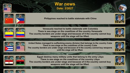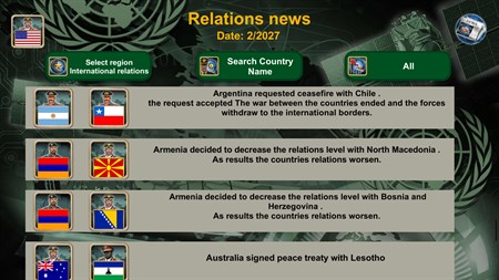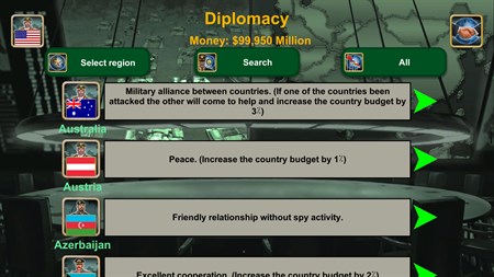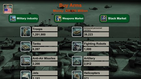 The game offers a wide range of features, including access to global Weapons Suppliers, a Spy Center, a War Room, Diplomats, the United Nations, an Economy system, Technology, and World News Distribution (Economy, Relations, Spy, and War). All this is powered by advanced Artificial Intelligence.
