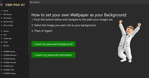 With XSM PRO you have access to a huge library of Images in HD and 4K. Also you are able to set your Background and your Lockscreen (Lockscreen only Windows10) for your Windows 10 Desktop and your Xbox One dashboard in no time. The PRO version of XSM get updates so the library of images is getting biggger and bigger. For now there are hundreds of 4K and HD wallpapers you be able to set as your background and your lockscreen and of course no ads like the free version. Also you can add pictures from different categories to your personal favorite list. With update V.2.2.1 you´re now able to add your private pictures to your personal library "My Library". You can use internal storage, external devices or OneDrive to import your pictures. Try it!