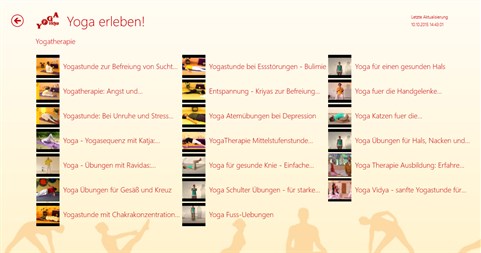 Folgende Kategorien sind vorhanden: - Mitmachyoga - Yoga für Anfänger - Meditation - Yoga Mittelstufe - Yogatherapie