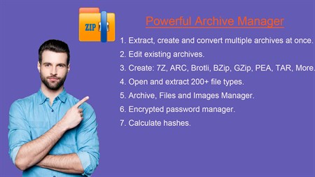 Features of Zip Extractor Pro includes extract, create and convert multiple archives at once, edit existing archives, create self-extracting archives (sfx), split files, strong encryption with two factor authentication, encrypted password manager, secure deletion, find duplicate files, calculate hashes, export task definition as command line script.