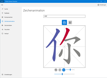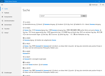 Das 101dict Character Dictionary stellt detaillierte Informationen wie Übersetzungen, Unihan-Daten und Strichfolge-Animationen für mehr als 9.500 chinesische Schriftzeichen bereit. Sie können Zeichen direkt eingeben oder nach Zeichen suchen. Die Zeichensuche unterstützt die Eingabe von chinesischen Schriftzeichen, Pinyin, Zhuyin (Bopomofo) oder Jyutping sowie die Eingabe von Text in deutscher, englischer, französischer oder ungarischer Sprache.