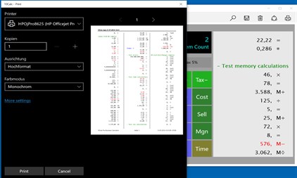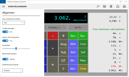 10Calc ist ein professioneller vollwertiger Druckrechner, entworfen für Windows 10 PCs, Tablets und Handys. Diese App ersetzt Ihren Tischrechner komplett. In der Tat ist sie wesentlich besser, da sich das Band als Datei speichern und laden lässt, und auch gesucht, gedruckt, oder gemailt werden kann. Sie können sogar Bandfehler korrigieren und Zeilen einfügen bzw. löschen (Versuchen Sie so etwas mit einem gewöhnlichen Tischrechner!)