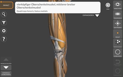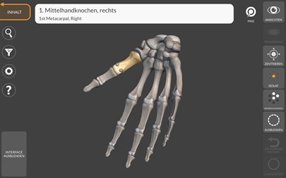 EINFACHE UND LEICHT ZU BEDIENENDE OBERFLÄCHE • Rotation und Vergrößerung jedes Modells im 3D Raum • Unterteilung durch Regionen für eine klare und schnelle Visualisierung jeder Struktur • Die Muskeln sind in Schichten gegliedert, von der Oberfläche zur Tiefsten • Visualisierung der Muskelschichten im Multi- oder Singlemodus • Möglichkeit jeden einzelnen Knochen oder Muskel zu verbergen • Filterfunktion zum Verbergen und Anzeigen jedes Systems • Intelligente Rotation, automatische Verschiebung des Zentrums für eine einfache Navigation • Interaktive Stecknadeln erlauben die Anzeige jedes Begriffes relativ zu jedem anatomischen Detail • Bedienoberfläche verbergen/anzeigen, ideal für die Nutzung auf Smartphones • Beschreibungen von Muskeln (Ursprung, Ansatz, Aktion), auf Englisch