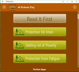 Perfect Apps is presenting 40 Spiritual Cures, a booklet written by Amir-e-Ahl-e-Sunnat, founder of Dawateislami. Use this easy Application with an eye catching interface and persuade other Islamic brothers and sisters to do the same. Perfect Apps is Software development Company. It is specialized in providing software products as well as custom application development service through a wide variety of fields including Manufacturing, Trading, Education, Shipping and Accounts. Perfect Apps Software Solutions: * Point of Sale (P.O.S) with Bar code * Accounts Management * Trading Distribution Management * School Management * Ticketing Management * Payroll System * Biometric Solution Send your valuable opinions and suggesstions on following email address: perfectapps1112@gmail.com