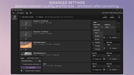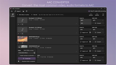 Convert MP3 and more audio input formats to AAC: • MP3, AAC, OGG, FLAC, M4A, M4B, CAF, WAV, AIFF, WMA, AC3, MP2.