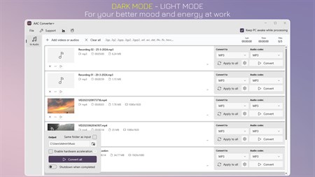 • Enable hardware acceleration to save time. • Auto shutdown when completed. • Save time with multiple files processed at once or focusing on a single video. • Keep PC awake while processing.