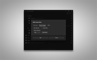 Click the '+' button to add a new Jump Item. Jump Items can be a Group, File/Folder, or a URL. If adding a Group, click Group, enter in a Group Name, then click Add button. If adding a File/Folder, click File/Folder. If you have already created a Group, you can select a 'Parent' (Group). This will nest your new File/Folder under that Group. If you've selected a Parent and change your mind, click on 'Clear Parent' button to clear the parent combobox. To browse to a File/Folder, select either 'Add Files' or 'Add Folder', then click 'Add' button. This will launch the Windows Explorer chooser. Choose whatever items needed. For Files, you can select multiple. For Folders, you can select a single Folder. When complete, click 'Open' for Files or 'Select Folder' for Folder. New items are added to the main view list. If you had selected a Parent, new items will be nested under the appropriate Parent (Group).