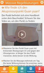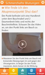 Das können Sie sofort mit der App erreichen: → Starke Periode lindern → Schmerzhafte Periode lindern → Kopfschmerzen lindern → Blutdruck senken → Übelkeit und Erbrechen lindern → Herzschmerzen lindern → Weinerlichkeit beseitigen → Schlafstörungen beseitigen → Ermüdung lindern → Depression lindern