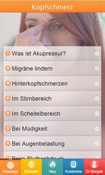Das können Sie sofort mit der App erreichen: → Migräne lindern → Hinterkopfschmerzen lindern → Stirnkopfschmerzen lindern → Kopfschmerzen im Scheitelbereich lindern → Kopfschmerzen bei Müdigkeit lindern → Kopfschmerzen bei Augenbelastung lindern → Kopfschmerzen bei Bluthochdruck lindern → Kopfschmerzen nach Alkoholkonsum lindern → Kopfschmerzen nach Kopftrauma lindern → Kopfschmerzen bei Wetterveränderungen lindern
