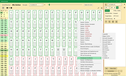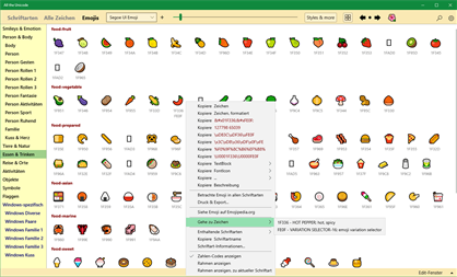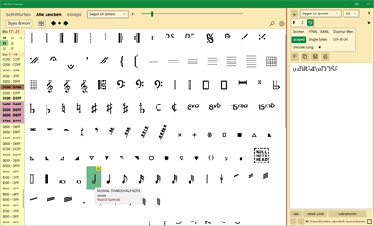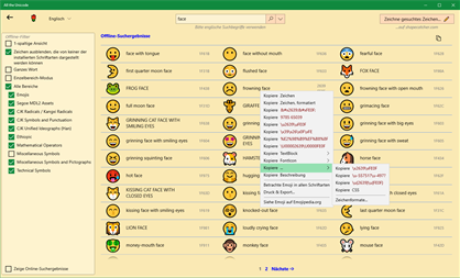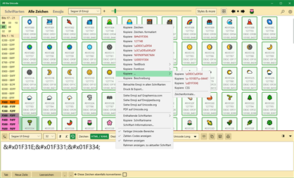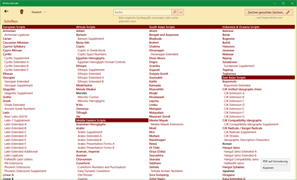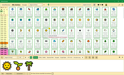 Übersicht aller verfügbaren Unicode-Zeichen, inklusive Emojis. Wandeln Sie ausgewählte Zeichen in ein benötigtes Format um (für Entwickler) oder kopieren Sie Zeichen in die Zwischenablage. Navigieren Sie von der Übersicht aller Unicode-Bereiche zu den Zeichen. Finden Sie in über 54.000 Zeichen das gewünschte durch Eingabe eines Suchwortes. Betrachten Sie in einer Übersicht Textproben in allen Schriftarten. Alle Emojis sind übersichtlich in Kategorien unterteilt. Diverse Informationen zu den Schriftarten sind einsehbar. Welche Zeichen dargestellt werden können, hängt von den installierten Schriftarten ab. Entwickelt für PC & Tablet.