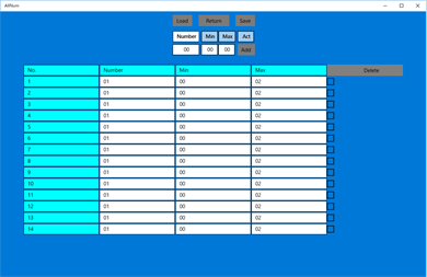 Settingボタンで遷移した画面のSaveボタンで、表示されている内容を任意の場所にファイル名を付けて保存できます。 保存した内容は、Settingボタンで遷移した画面、GetNumberボタンで遷移した画面のLoadボタンで読込めます。