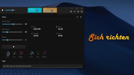 ### Steigern Sie Ihre Produktivität Bringen Sie Ihre Produktivität mit unserem innovativen Fokus-Timer auf ein neues Niveau. Konfigurieren Sie Ihre Fokus- und Ruheintervalle und lassen Sie sich von Ambie durch Ihre individuellen Fokussitzungen führen. Diese Sitzungen sollen Ihnen dabei helfen, sich auf Ihre Aufgabe zu konzentrieren, und wir erinnern Sie daran, gelegentlich eine Pause einzulegen, um frisch zu bleiben.