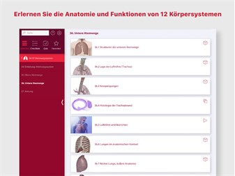 Diese App umfasst 12 Einheiten mit 50 Kapiteln/Modulen, die über 500 voreingestellte Ansichten von 3D-Modellen, mehr als 150 Abbildungen und Animationen, Dutzende histologische Folien und Hunderte von Quizfragen verwenden.