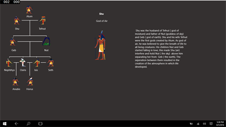 The app is designed and made to provide the knowledge about the Gods in Ancient Egypt. Users can easily browse between different Deities in an easy and user friendly way. Moreover, users can also see the Pharaohs God's family tree and get information about each member. To check what they have learnt and to test their skills, users are also able to take an interactive test in which they can test their knowledge. The app is designed to work on mobile phones, tablets and desktops.