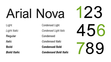 Arial Nova stellt eine leichte Überarbeitung der klassischen Arial-Familie dar. Sie ist für Absätze und Überschriften von Dokumenten geeignet. Diese Schriftarten sind für europäische Sprachen mit lateinischen, griechischen und kyrillischen Skripts ausgelegt. Die folgenden Stile sind verfügbar: Arial Nova Arial Nova Italic Arial Nova Light Arial Nova Light Italic Arial Nova Bold Arial Nova Bold Italic Arial Nova Cond Arial Nova Cond Italic Arial Nova Cond Light Arial Nova Cond Light Italic Arial Nova Cond Bold Arial Nova Cond Bold Italic