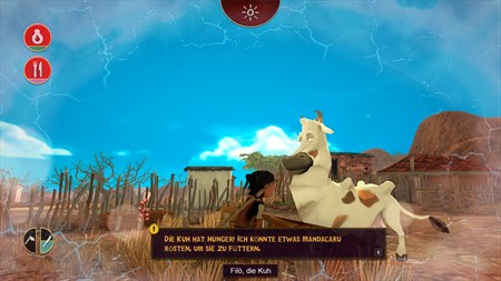 Interagiere, um zu überleben: Hunger und Durst können im Hinterland während der Dürre sehr grausam sein. Bitte die Ältesten deines Dorfes um Hilfe und löse ihre Aufgaben, um Wasser und Nahrung zu bekommen.