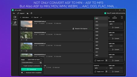 Convert ASF to MP4, MP3 and more. ???? Convert multiple files at once, there's no limit to how many files. ???? All processing is performed locally on your computer where your files remain safe and private.